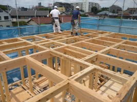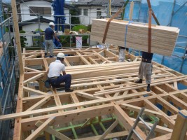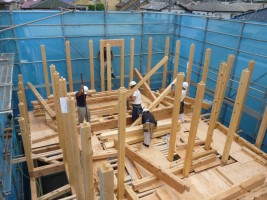 k●2階の柱建てが終わり、桁掛け作業中です。